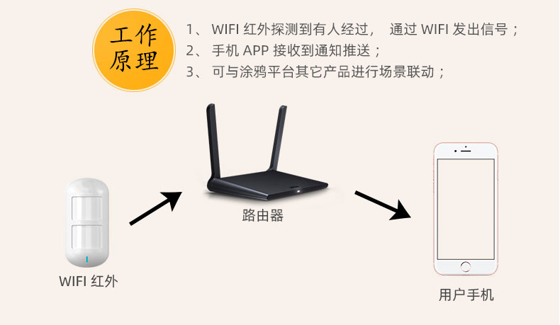 概述:wifi紅外探測(cè)到人體經(jīng)過(guò),通過(guò)WIFI發(fā)送信號(hào),手機(jī)APP接收到推送,可與涂鴉其他產(chǎn)品聯(lián)動(dòng)。